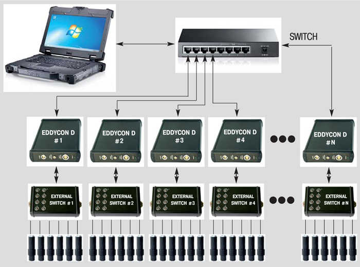 该系统实现了3个涡流多通道探伤仪Eddycon D与3个外部开关和64个ECP的组合。